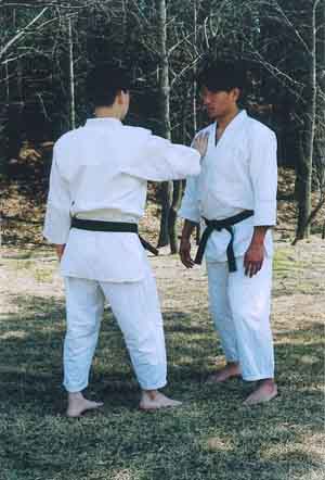 attack but uke blocks it by raising an arm. Tori makes contact,